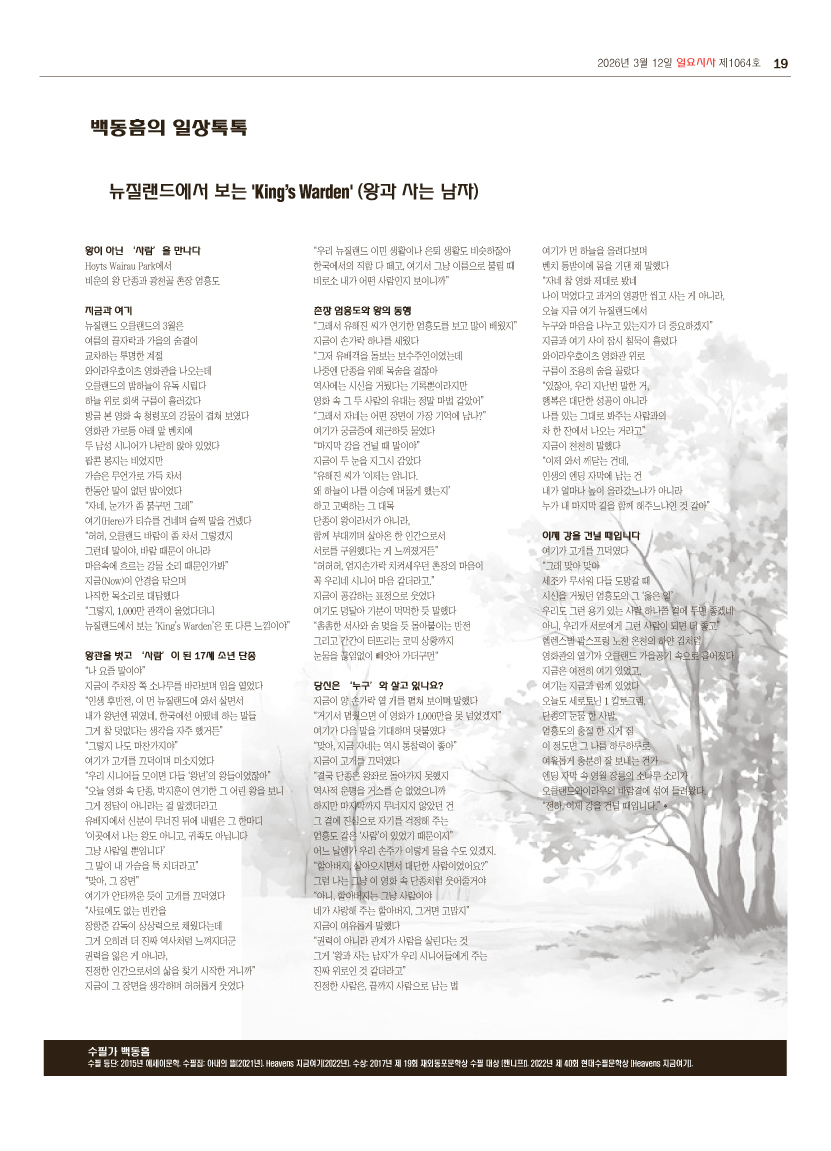 “고마워서 하는 선물이오. 늙은 홀아비, 누구 하나 받아주지 않았는데… . 내 허리 병도 낫고, 잠자리 숙소도 해결됐고, 급여까지 주니 고마울 수밖에. 그동안 받은 급여, 알뜰히 쓰고 모았더니 만 불이 됐소. 돌려 드리니 건강에 좋은 것 사 드시오. 여행도 다녀오시고.”