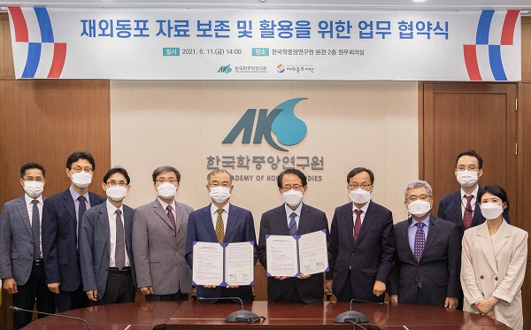 재외동포재단(이사장 김성곤)과 한국학중앙연구원(원장 안병우)은 재외동포 관련 자료보존 및 활용의 필요성에 대해 공감하고, 정보 및 자원의 공유와 연구를 위해 6월 11일 업무협약을 체결했다.