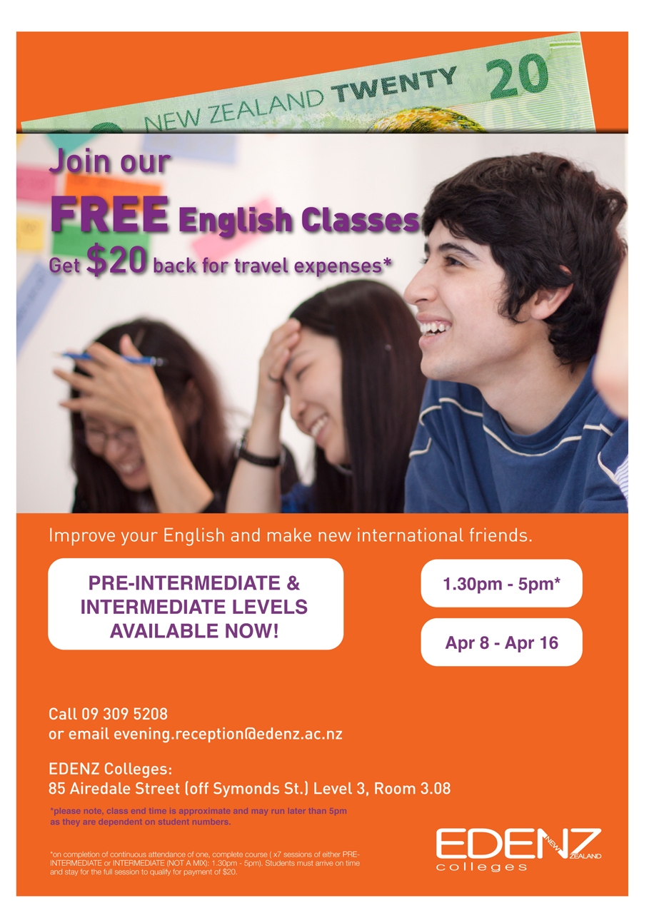 무료 영어교실 개강 에덴즈 알림마당 0 1509 2013.04.05 15:11 에덴즈 칼리지에서 무료 영어교실을 개강합니다.1. 기간 4월 8일 ~ 16일 오후 1.30~5시2. 장소: 3.08호 EDENZ Colleges, 85 Airedale St. Auckland CBD3. 대상: 프리인터 인터레벨 정도이면 누구나 들을 수 있습니다4. 방법: 예약 없이 에덴즈 칼리지 3층으로 오시면 됩니다.