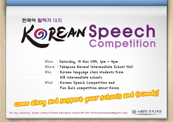 ‘제3회 한국어 말하기 및 퀴즈 대회’를 개최 뉴질랜드 한국교육원 알림마당 0 1911 2015.10.29 13:49 뉴질랜드 한국교육원(원장 원유미)은 2015. 11. 14(토) 13:00에 타카푸나노멀인터미디어트스쿨에서 ‘제3회 한국어 말하기 및 퀴즈 대회’를 개최한다.