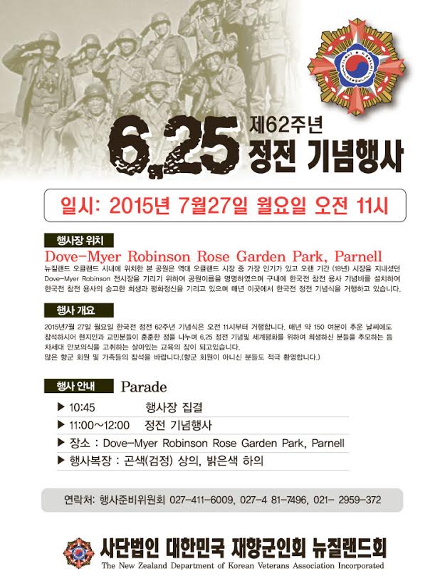 < 7월 27일> 제62주년 6,25 정전 기념행사 재뉴 재향군인회 알림마당 0 1864 2015.07.25 13:09 많은 향군회원및 가족들의 참석을 바랍니다.(향군 회원이 아니신분들도 적극 환영합니다.)