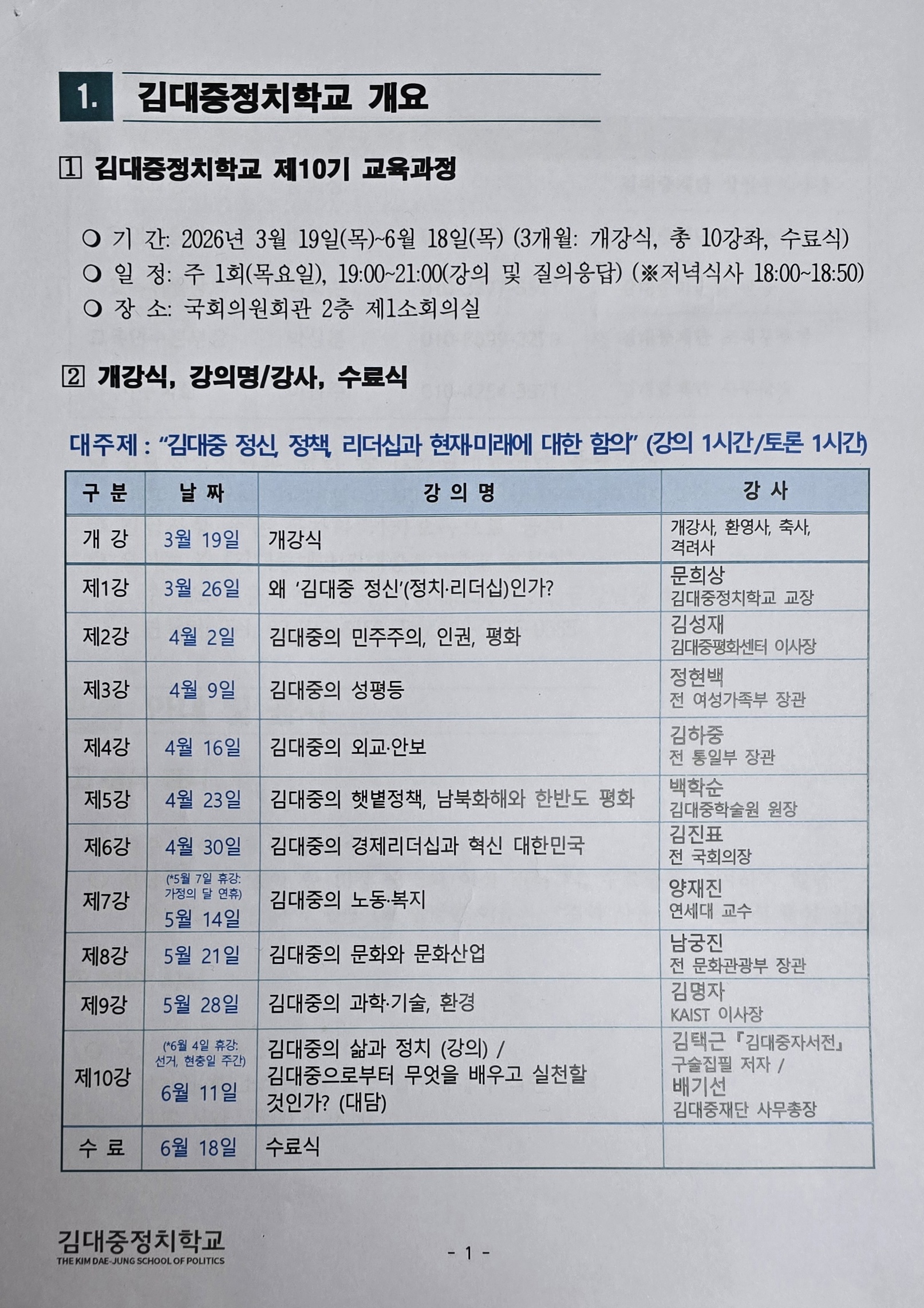 김대중정치학교 해외 수강생모집. 일요시사 알림마당 0 44 01.27 23:24 김대중정치학교 <제 10기>강의내용김대중정치학교 해외 수강생모집.인터넷 수강이 가능한 해외 수강생 30명을 모집합니다.