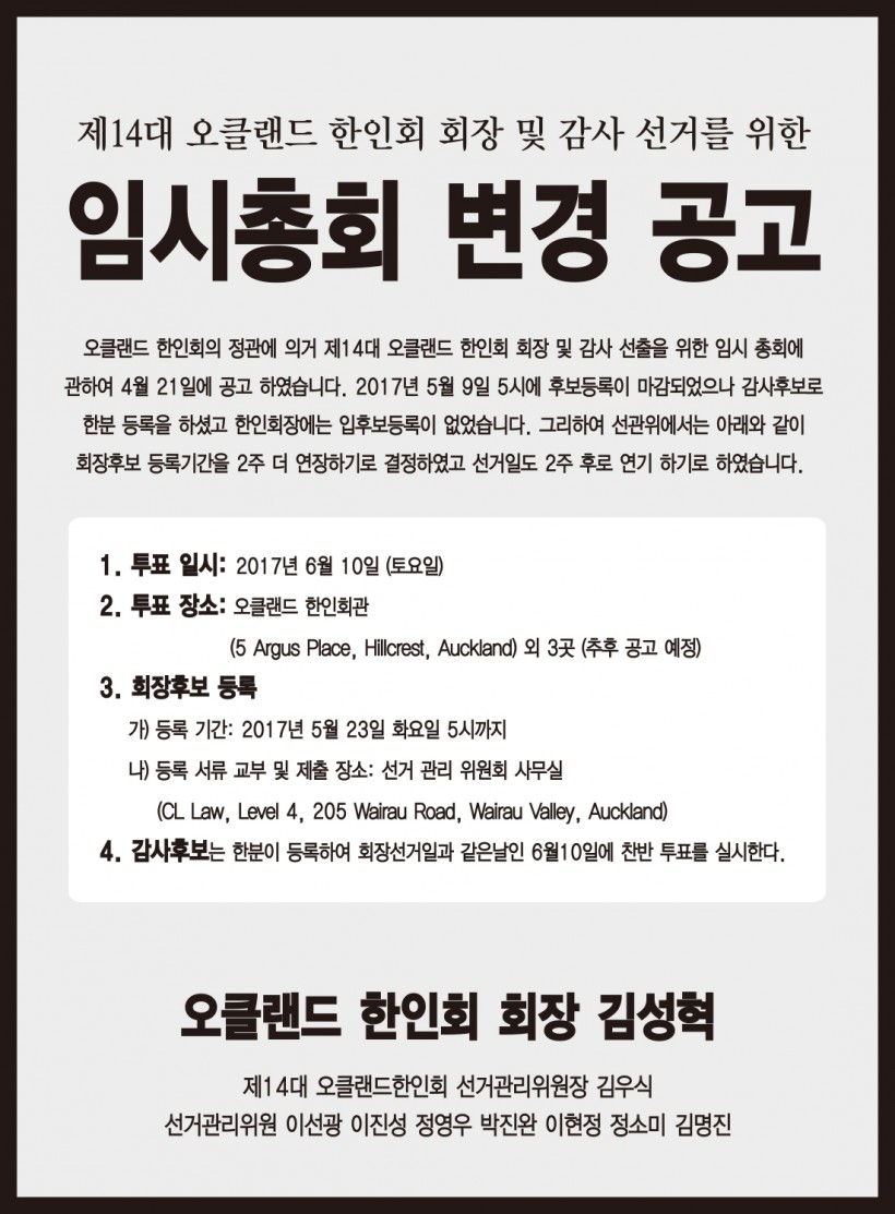 한인회 임시총회 변경 공고