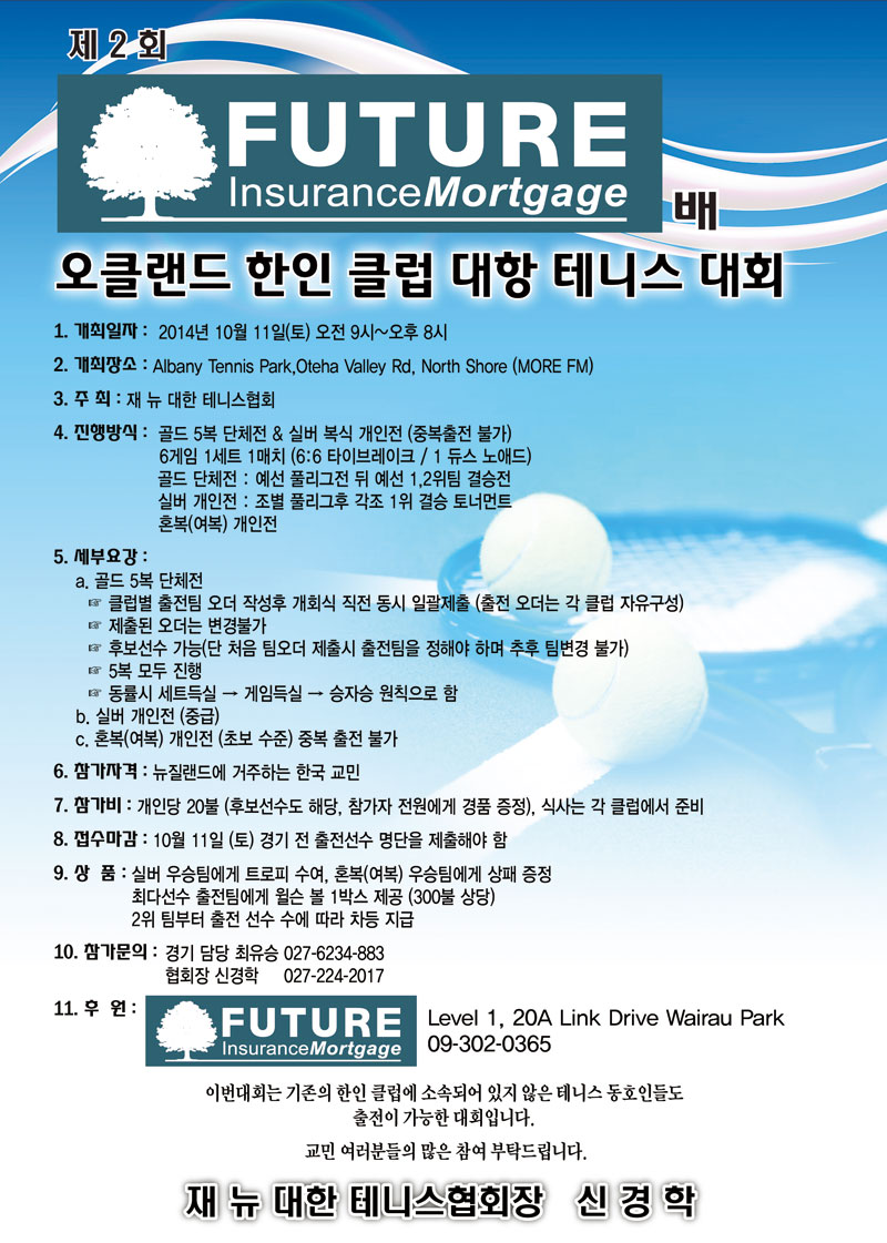 퓨처홈론 배 한인 클럽 테니스대회 안내 일요시사 알림마당 0 2547 2014.10.02 16:10 퓨처홈론 배 한인 테니스 대회가 10월 11일 토요일에 개최됩니다.많은 참여 바랍니다