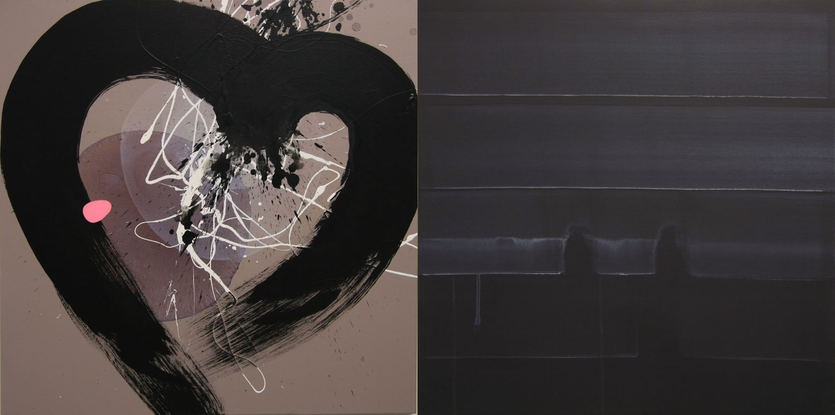 좌측 그림은 서체를 바탕으로 한 강렬한 에너지의 형상화이며 우측 그림은 깊은 내면의 침잠의 세계를 표출하고 있다