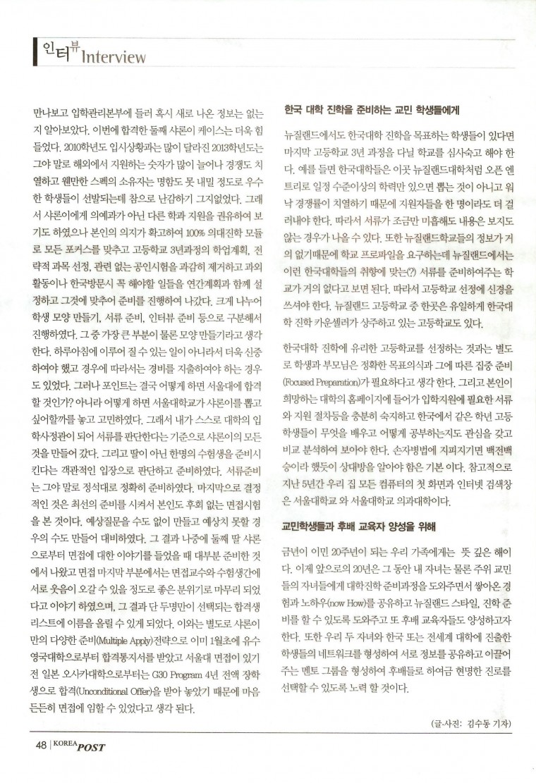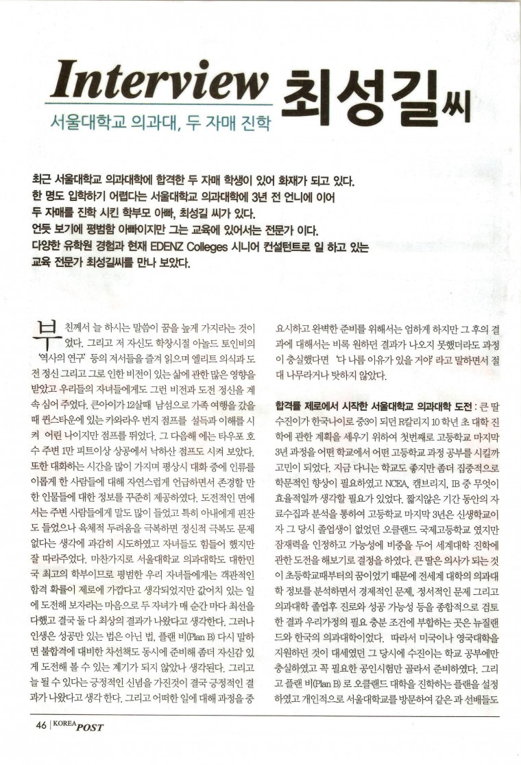 14년 연속 서울대 합격생을 배출하고 두자녀 모두 서울의대 합격시킨 노우하우로 학생과 학부모를 대상으로 뉴질랜드 조기유학과 한국 및 세계대학 지원을 주제로 개별상담 진행합니다.