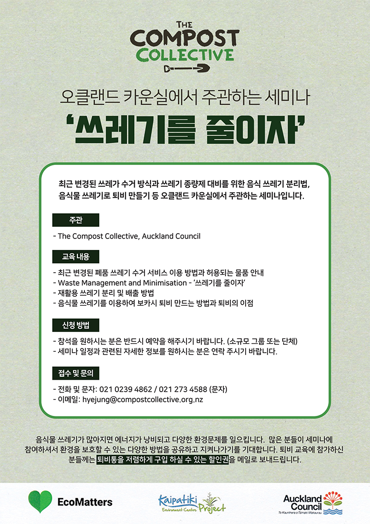쓰레기! 어떻게 분리하여 배출하는지 정확히 알고계시나요? 오클랜드 카운실에서 주관하는 세미나에 접수하세요!