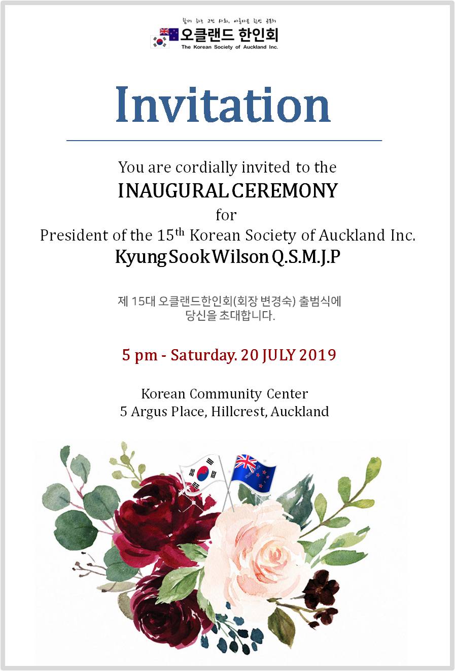 제 15대 오클랜드한인회 출범식에 초대합니다. 일요시사 알림마당 0 1694 2019.07.09 11:11 제 15대 오클랜드한인회 출범식에 초대합니다.꼭 참석을 부탁 드립니다.RSVP : 7.15(월) 까지 보내주시면 준비하는데 많은 도움이 되겠습니다.한인회장 변경숙 드림.