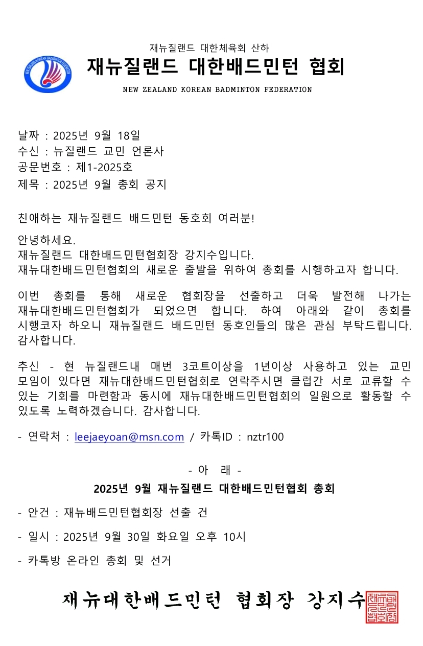 재뉴질랜드대한배드민턴협회 대위원회에서 총회를 실시하여 새로운 협회장을 선출 합니다 일요시사 알림마당 0 89 09.23 21:34 재뉴질랜드대한배드민턴협회 대위원회에서 총회를 실시하여 새로운 협회장을 선출합니다