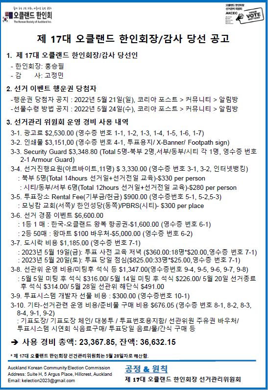 제 17대 오클랜드 한인회장/감사 당선 공고